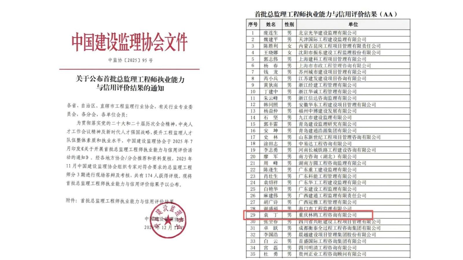 林鸥咨询公司袁丁同志获评全国首批AA级总监理工程师