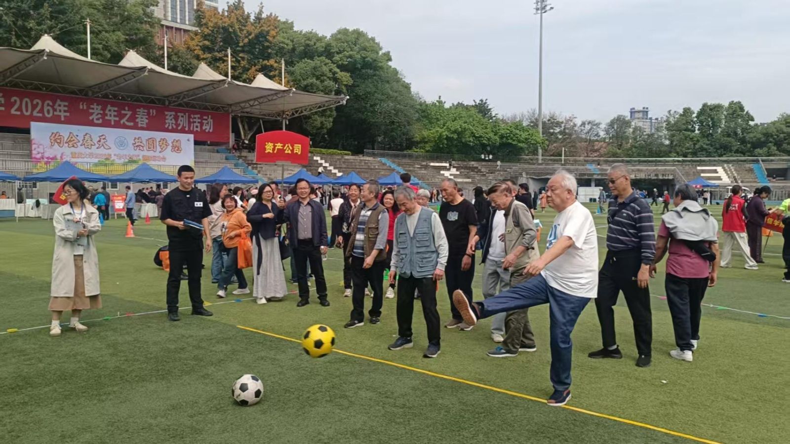 2026年4月15日下午,在资产公司离退休工作领导小组的统筹安排指导关心下,资产公司组织退休职工参加了在沙坪坝校区A校园思群广场以“约会春天、共圆梦想”为主题的2026年重庆大学离退休教职工趣味运动会。