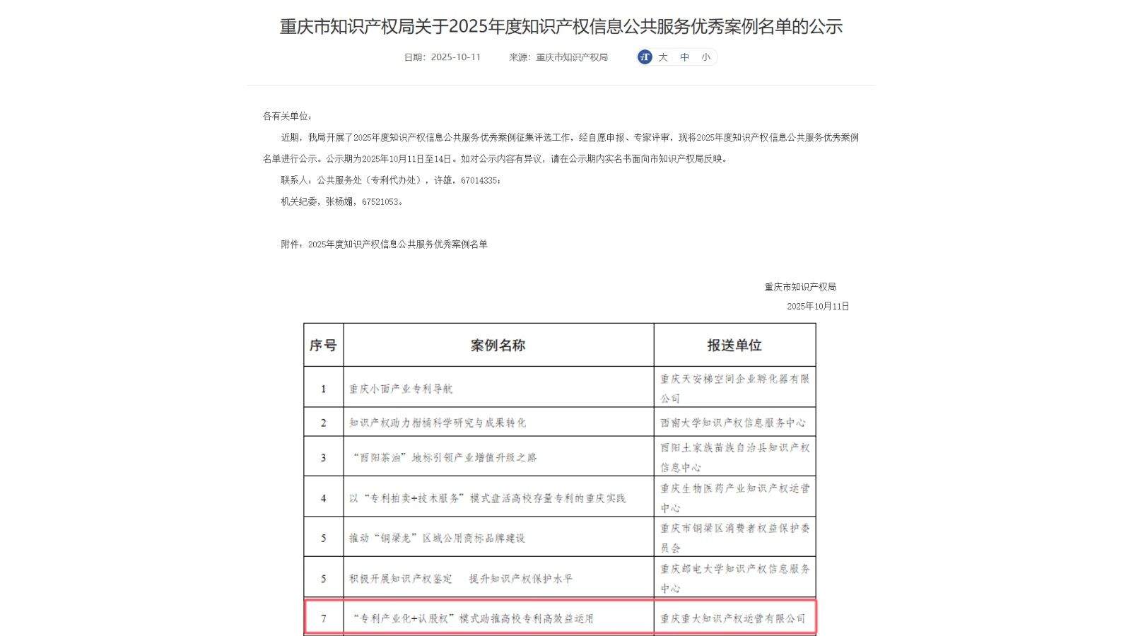 10月16日,2025年全国“知识产权服务万里行”重庆站系列活动启动仪式在重庆世纪金源大饭店举行。活动期间,公布了“重庆市2025年度知识产权信息公共服务优秀案例名单”,由重庆大学概念验证中心申报的《以“专利产业化+认股权”模式助推高校专利高效益运用》案例成功入选。
