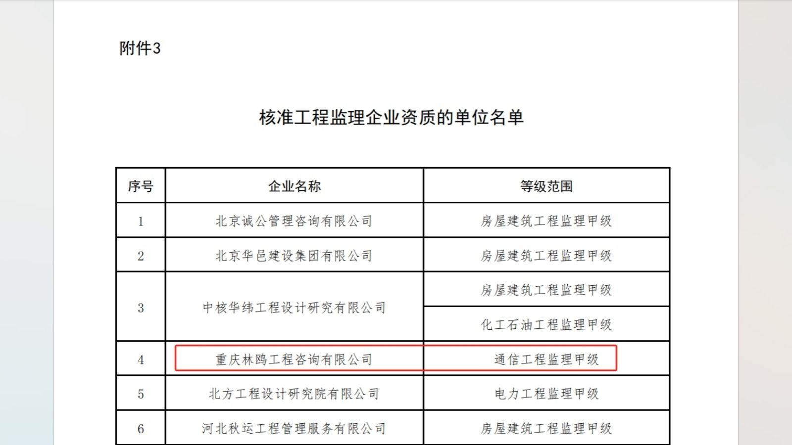 近日,林鸥咨询公司获住建部2026年第三批核准,成功取得通信工程监理甲级资质。至此,林鸥咨询公司已持有房屋建筑、市政公用、机电安装、通信工程4项监理甲级资质,综合实力迈上新台阶。